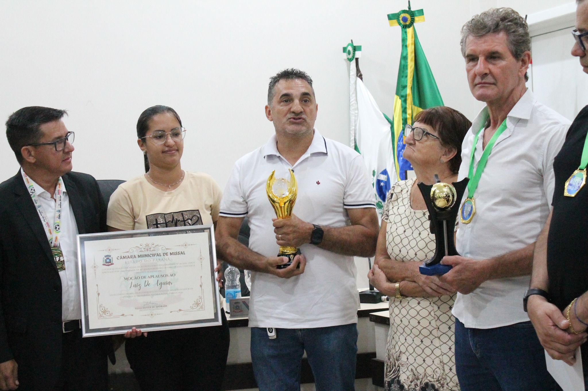A Câmara Municipal de Missal realizou a entrega de uma Moção de Aplausos ao senhor Luiz de Aguiar, em reconhecimento aos relevantes serviços prestados à comunidade missalense e pela conquista do título de melhor jogador da categoria 55+ do Paraná, durante a Gala Futsal Paraná 2025.
