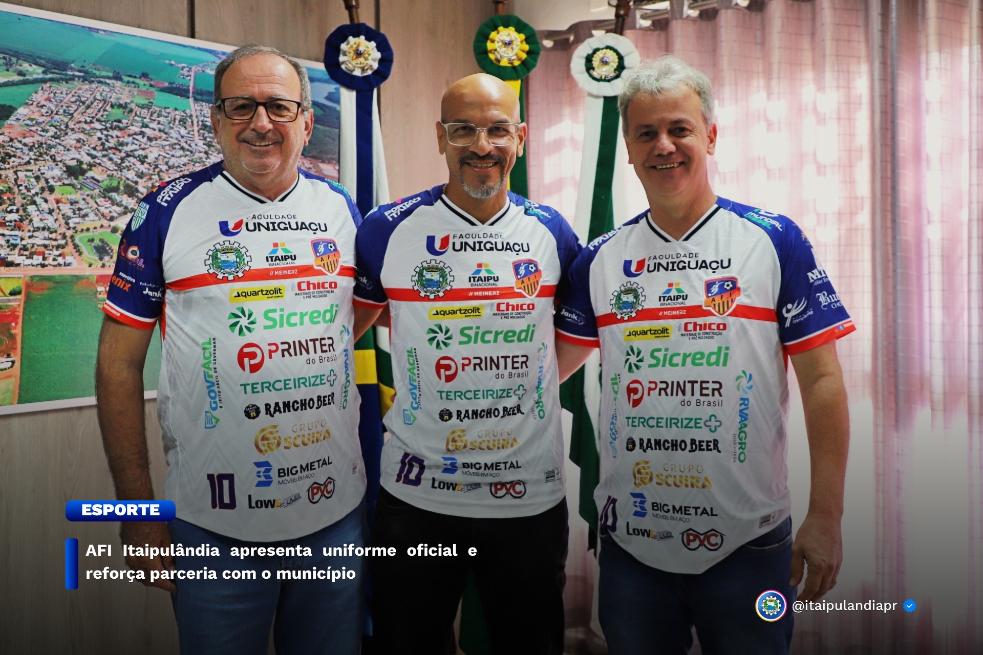 Na manhã desta quarta-feira (01), o Presidente da Afi Uniguaçu/Itaipulândia, Claudemir Pereira dos Santos, realizou a entrega oficial da camisa da equipe ao prefeito Lindolfo Rui e ao Vice-Prefeito Adolfo Preis. O ato simbólico reforça o apoio institucional ao esporte local e marca o início das atividades da equipe na competição regional.