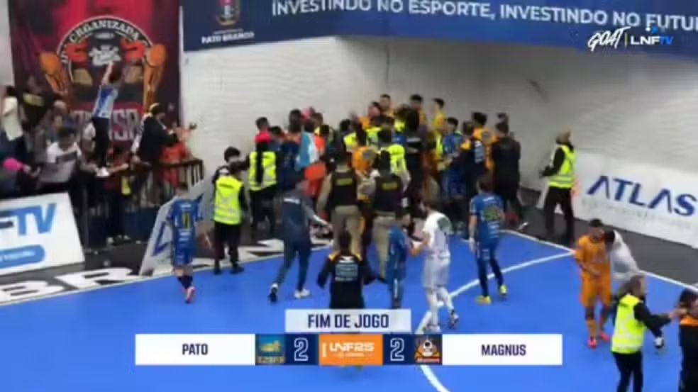 A confusão iniciou logo depois do árbitro encerrar o jogo entre os times Pato, de Pato Branco, e Magnus, de Sorocaba (SP). A partida da Liga Nacional de Futsal terminou em 2 a 2, mas durante a disputa o Pato Branco teve um gol anulado.